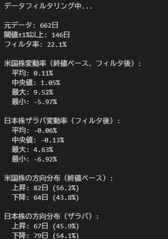 print(f" 下降: {jp_down}日 ({jp_down/len(filtered_df)*100:.1f}%)")【出力結果】