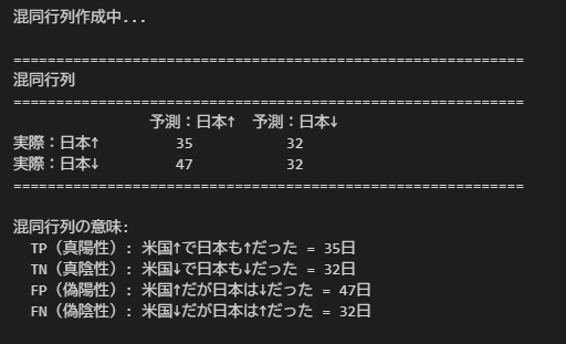 print(f" FN(偽陰性): 米国↓だが日本は↑だった = {fn}日")【実行結果】