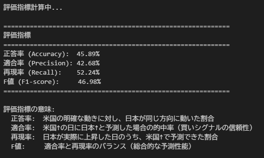 print(f" 再現率: 日本が実際に上昇した日のうち、米国↑で予測できた割合")